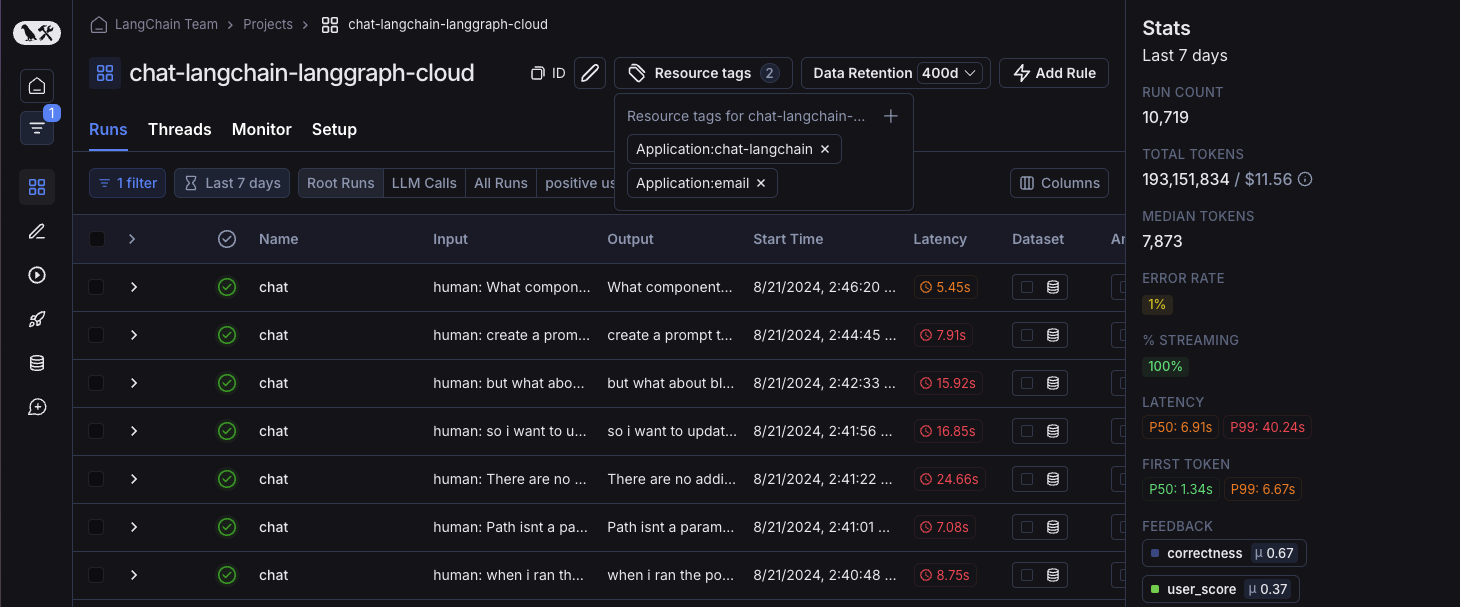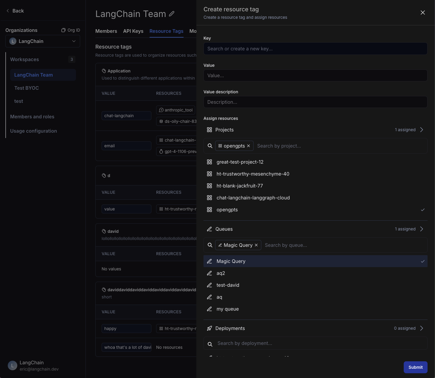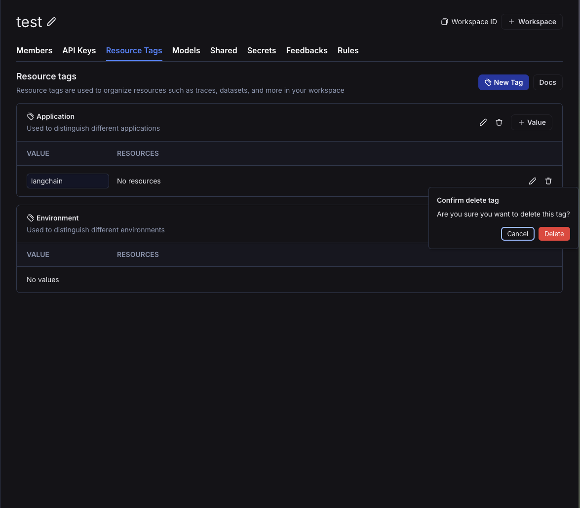 Not to be confused with commit tags: Resource tags are key-value pairs used to organize and filter workspace resources (projects, datasets, prompts, etc.). Commit tags are labels that reference specific versions in a prompt’s commit history. While both types of tags can use similar terminology (like prod or staging), resource tags help you organize resources across your workspace, while commit tags control which version of a prompt is used in your code.
